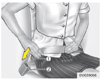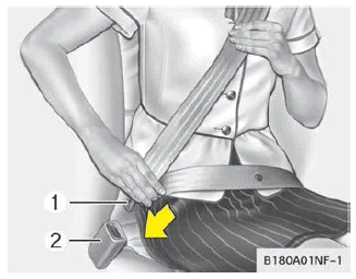 Um Ihren Gurt anzulegen, ziehen Sie das Gurtband aus der Gurtrolle und schieben Sie die Schließzunge (1) in das Gurtschloss (2). Ein Klickgeräusch zeigt an, dass die Schließzunge im Gurtschloss verriegelt ist.