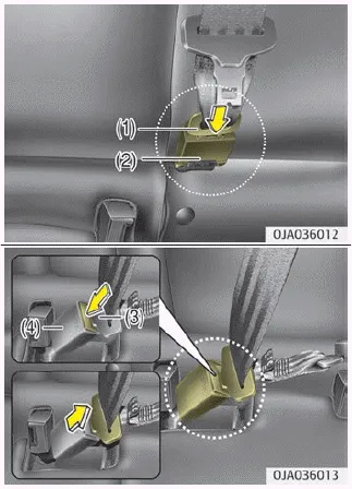 Das Gurtschloss des mittleren Beckengurts unterscheidet sich von den Schlössern der hinteren Dreipunktgurte. Wenn Sie einen Rücksitzgurt anlegen, vergewissern Sie sich, dass das passende Gurtschloss benutzt wird, um maximalen Schutz durch das Sicherheitsgurtsystem und eine einwandfreie Funktion zu erlangen.