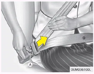 Sie können den Gurt ablegen, indem Sie die Entriegelungstaste (A) im Gurtschloss drücken. Wenn das Gurtschloss geöffnet ist, wird das Gurtband automatisch in der Gurtrolle aufgerollt. Wenn sich der Gurt nicht aufrollt, vergewissern Sie sich, dass das Gurtband nicht verdreht ist, und versuchen Sie erneut, den Gurt aufrollen zu lassen.