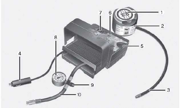 10. Schlauch zum Anschluss des Kompressors und der Dichtmittelflasche bzw. des Kompressors und des Rades