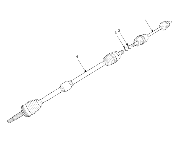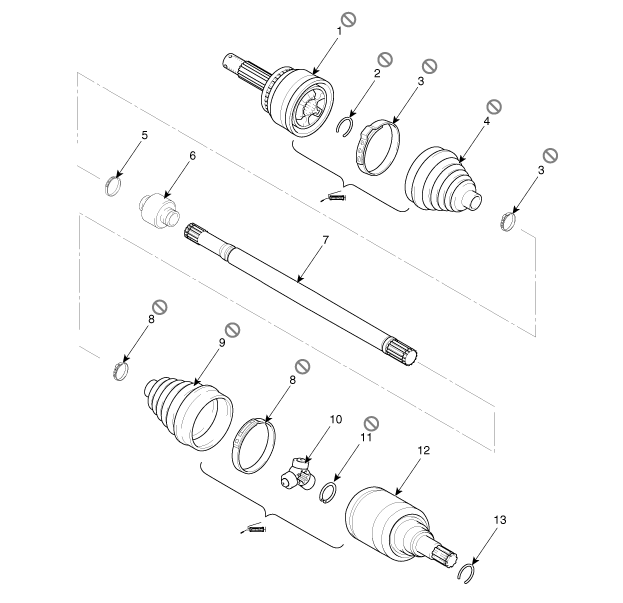 | 1. Kugelgelenk 2. Clip 3. Faltenbalgschelle (Kugelgelenk) 4. BJ-Faltenbalg | 5. Schwingungsdämpferschelle 6. Schwingungsdämpfer 7. Welle 8. TJ-Faltenbalgschelle | 9. TJ-Faltenbalg 10. Tripodegelenk 11. Sprengring 12. TJ-Gehäuse | 13. Sprengring |