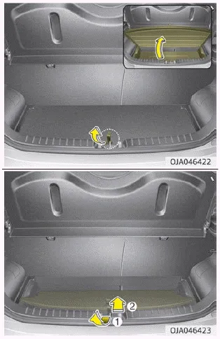 In diesem Staufach können Sie Verbandkasten, Warndreieck, Werkzeuge usw. unterbringen – Dinge, die Sie bei Bedarf schnell brauchen. Erfassen Sie den Griff oben an der Abdeckung und heben Sie die Abdeckung damit an.