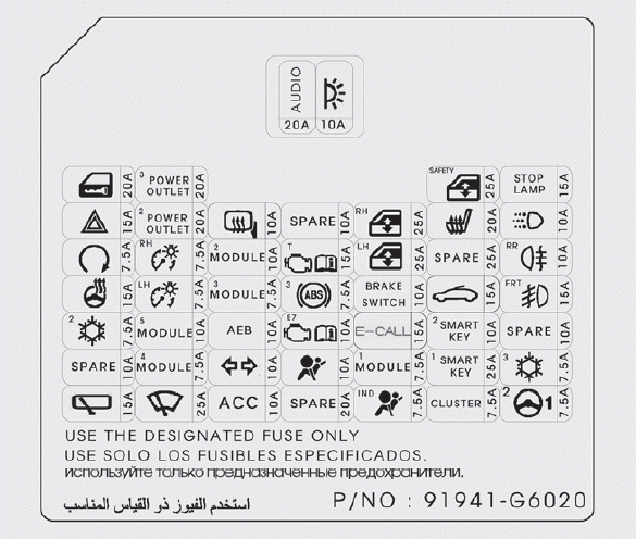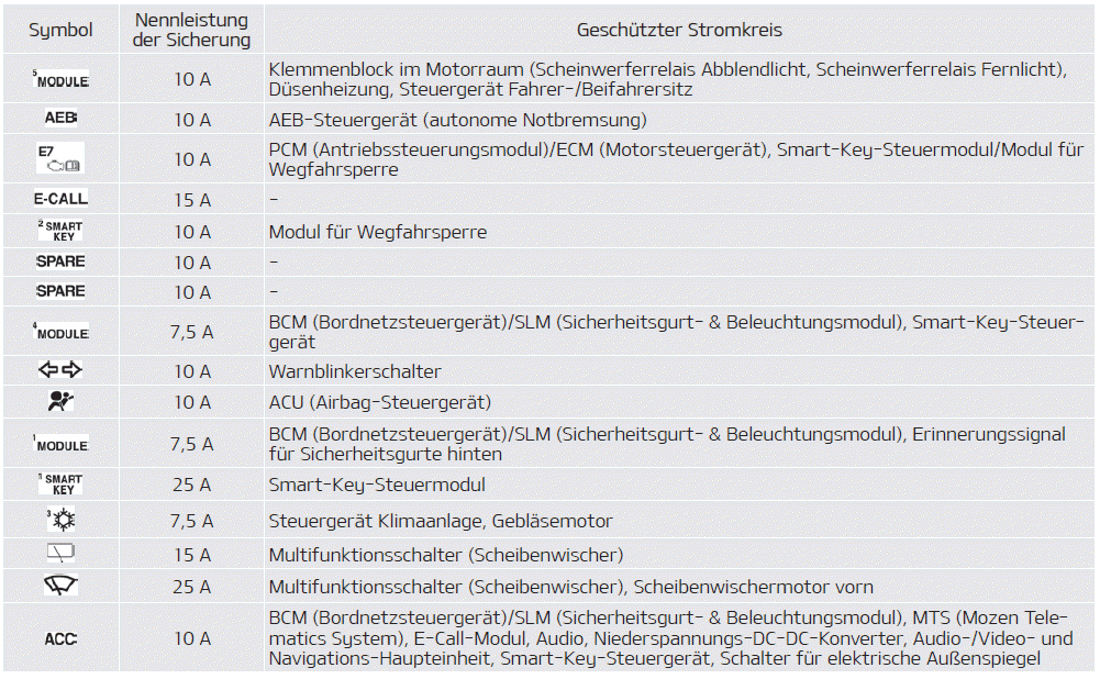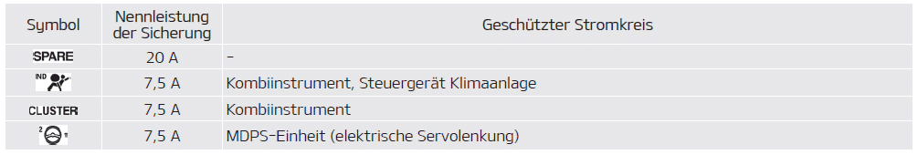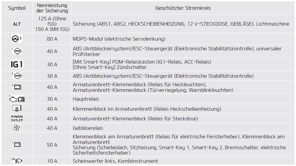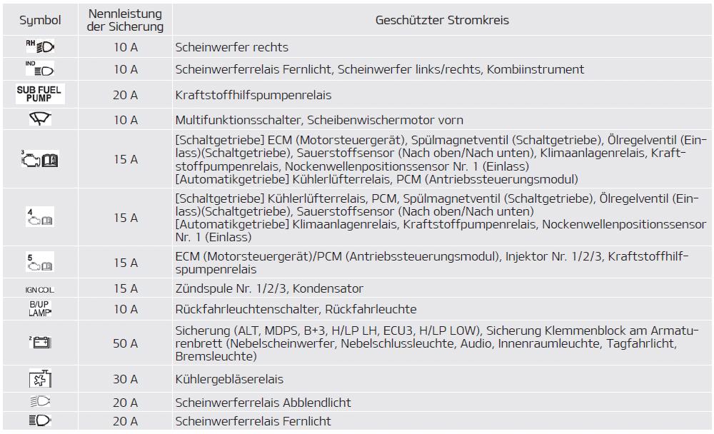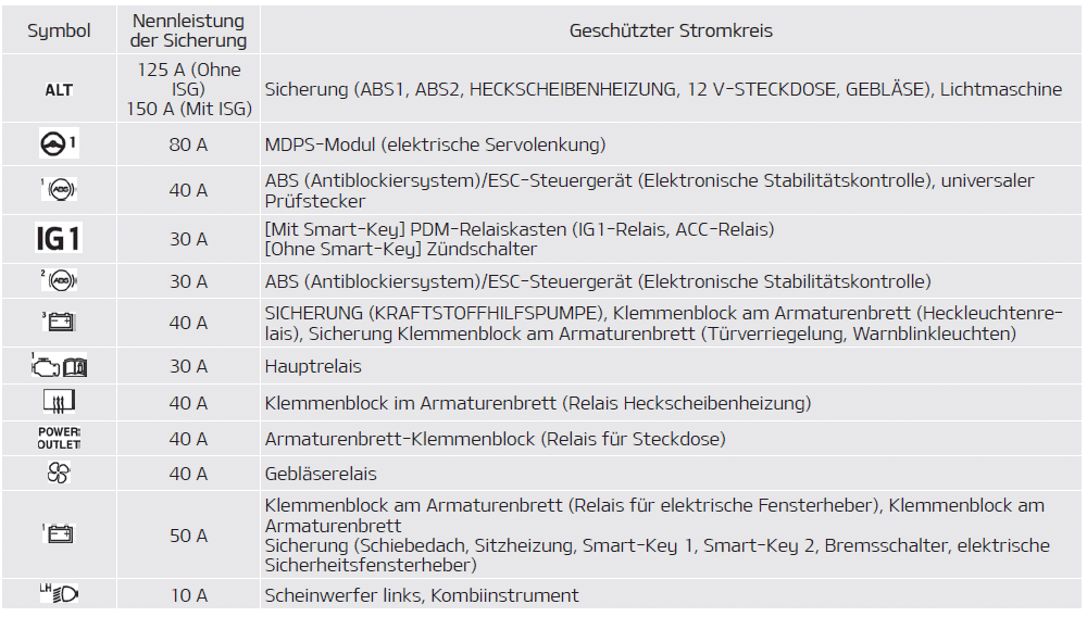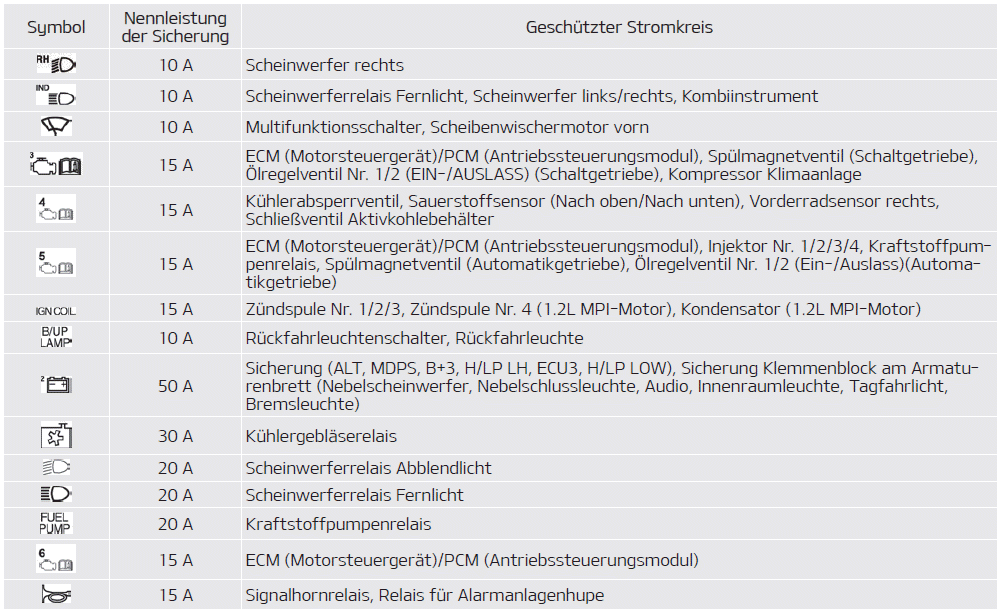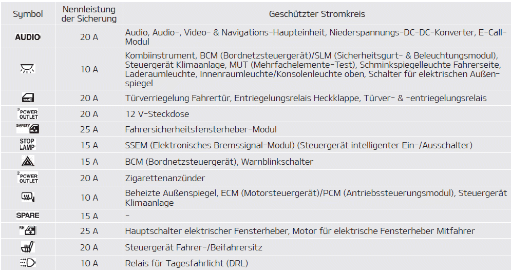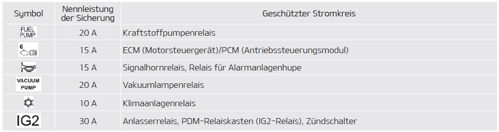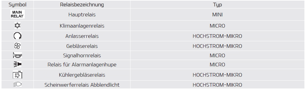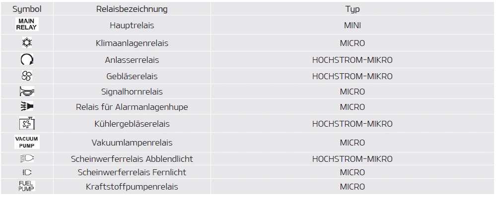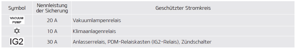 Auf der Unterseite der Sicherungs-/ Relaiskastendeckel befindet sich je eine Aufstellung der enthaltenen Sicherungen/ Relais inkl. ihrer Bezeichnungen und der zugehörigen Amperezahlen.