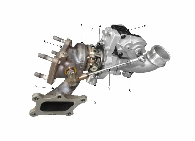 6. Kompressoreinlass 7. Mittelgehäuse 8. EWGA (Elektrischer Bypassventil-Stellantrieb) 9. Stellantriebstange |