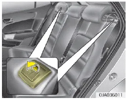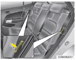 1. Wenn Sie die Rücksitzlehne umlegen, schieben Sie die Gutschnalle in die Tasche zwischen Rücksitzlehne und Sitzfläche. Achten Sie darauf, dass sich beide Sitzgurte nicht mit dem Gepäck oder der Ladung verwickeln. Führen Sie dann den Sicherheitsgurt durch die beiden Öffnungen an beiden Seiten.