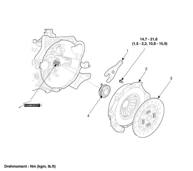 | 1. Kupplungsscheibe 2. Kupplungsdeckel 3. Ausrücklager 4. Kupplungs-Ausrückhebel |