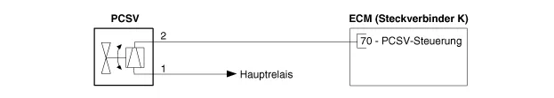 Das Regenerierventil (PCSV) steuert den Durchlauf zwischen Aktivkohlebehälter und Saugrohr. Dieses Magnetventil ist offen, wenn das ECM die Ventilsteuerleitung an Masse legt. Bei offenem Durchgang (PCSV EIN) werden die im Behälter vorhandenen Kraftstoffdämpfe zum Ansaugkrümmer weitergeleitet.