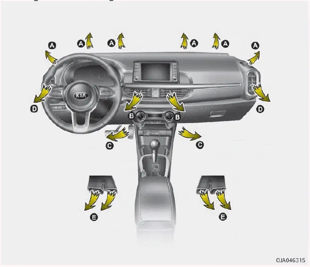 Der Modusschalter steuert die Richtung des Luftstroms im Belüftungssystem. Die Luft kann in den Fußraum, zu den Düsen im Armaturenbrett und zur Windschutzscheibe geleitet werden.
