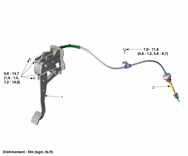 Bauteile und bauteile-Übersicht BAUTEILE-ÜBERSICHT [Kappa 1,0 MPI / FFV, Kappa 1,2 MPI] 1. Kupplungspedal 2. Kupplungszug Reparaturverfahren Ausbau 1.