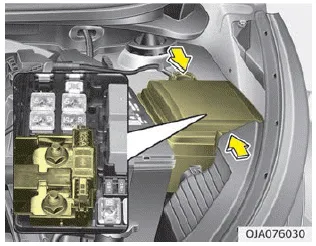 1. Schalten Sie die Zündung und alle elektrischen Schalter aus. 2. Öffnen Sie den Deckel des Sicherungskastens, indem Sie die Verriegelungen drücken und den Deckel abheben.