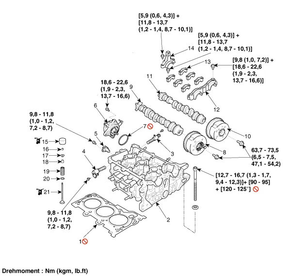 15. Mechanischer Ventilstößel (MLA) 16. Ventilkeil 17. Halter 18. Ventilschaftdichtung 19. Ventilfeder 20. Ventilfedersitz 21. Ventil |