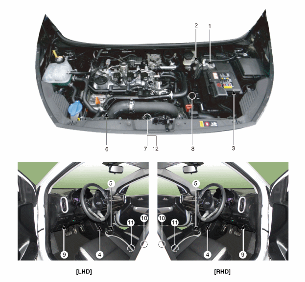 | 1. Batteriesensor 2. Bremskraftverstärker-Unterdrucksensor (BBVPS) 3. AGM-Batterie 4. DC/DC-Wandler 5. ISG-OFF-Schalter 6. Drehstromgenerator | 7. Starter 8. Neutralschalter 9. Kupplungsschalter 10. Türschalter 11. Sicherheitsgurtschalter 12. Motorhaubenschalter |