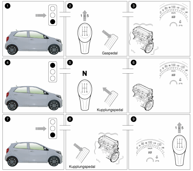 | 5. | Fahrer legt den Leerlauf ein und lässt das Kupplungspedal los. |