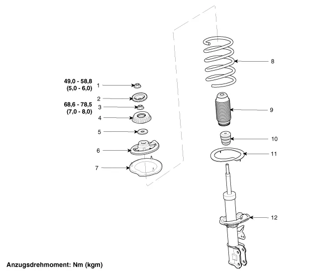 7. Oberer Federsitzring 8. Schraubenfeder 9. Staubschutz 10. Stoßfängergummi 11. Unterer Federsitzring 12. Stoßdämpfer |