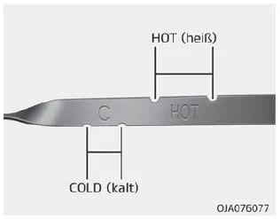 3. Vergewissern Sie sich, dass sich der Flüssigkeitsstand am Messstab im Bereich „HOT“ befindet. Wenn der Flüssigkeitsstand darunter liegt, füllen Sie spezifizierte Flüssigkeit durch die Einfüllöffnung nach. Wenn der Flüssigkeitsstand darüber liegt, lassen Sie Flüssigkeit durch die Ablassöffnung ab.
