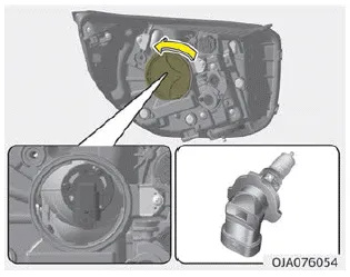 4. Entfernen Sie die Leuchtmittelfassung aus der Scheinwerferbaugruppe, indem Sie die Leuchtmittelfassung nach links drehen, bis die Nasen der Leuchtmittelfassung mit den Schlitzen der Scheinwerferbaugruppe übereinstimmen.