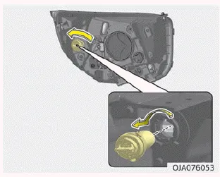5. Setzen Sie die Lampenfassung in die Scheinwerferbaugruppe ein, indem Sie die Rastnasen der Fassung auf die Aussparungen in der Scheinwerferbaugruppe ausrichten. Drücken Sie die Fassung in die Scheinwerferbaugruppe und drehen Sie sie im Uhrzeigersinn.