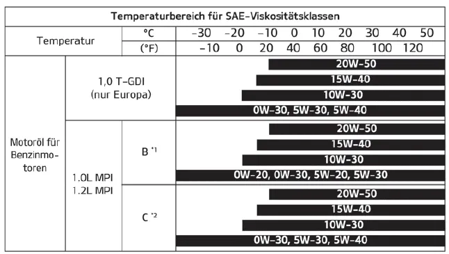 Berücksichtigen Sie bei der Auswahl des Motoröls den Temperaturbereich, in dem das Fahrzeug bis zum nächsten Ölwechsel betrieben werden soll. Wählen Sie die geeignete Viskosität aus der folgenden Tabelle aus.
