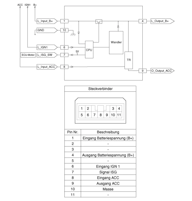 Über die Prüfkabel für Eingangsspannung und Anlasserrelais entscheidet die Elektronik, ob die Stromzufuhr zum Ausgang über die Umgehung oder DC/DC-Wandler erfolgt.