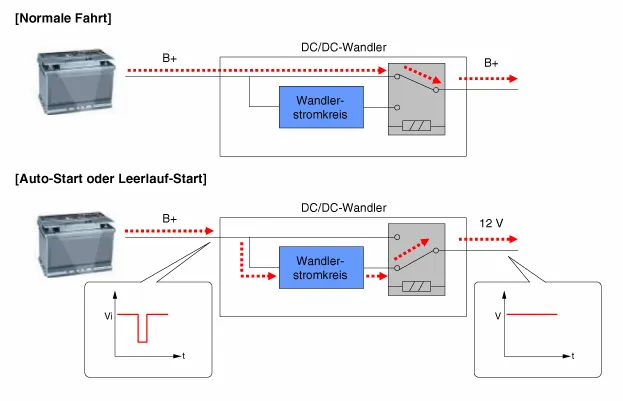 Um die Stromversorgung für bestimmte spannungsempfindliche elektrische Bauteile zu stabilisieren, wird ein DC/DC-Wandler zusammen mit der ISG-Funktion verwendet.
