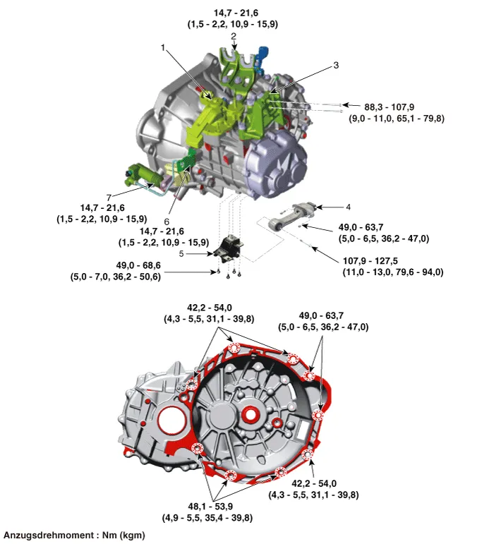 5. Getriebestützlagerhalter 6. Kupplungsschlauchhalter 7. Kupplungsausrückzylinder |